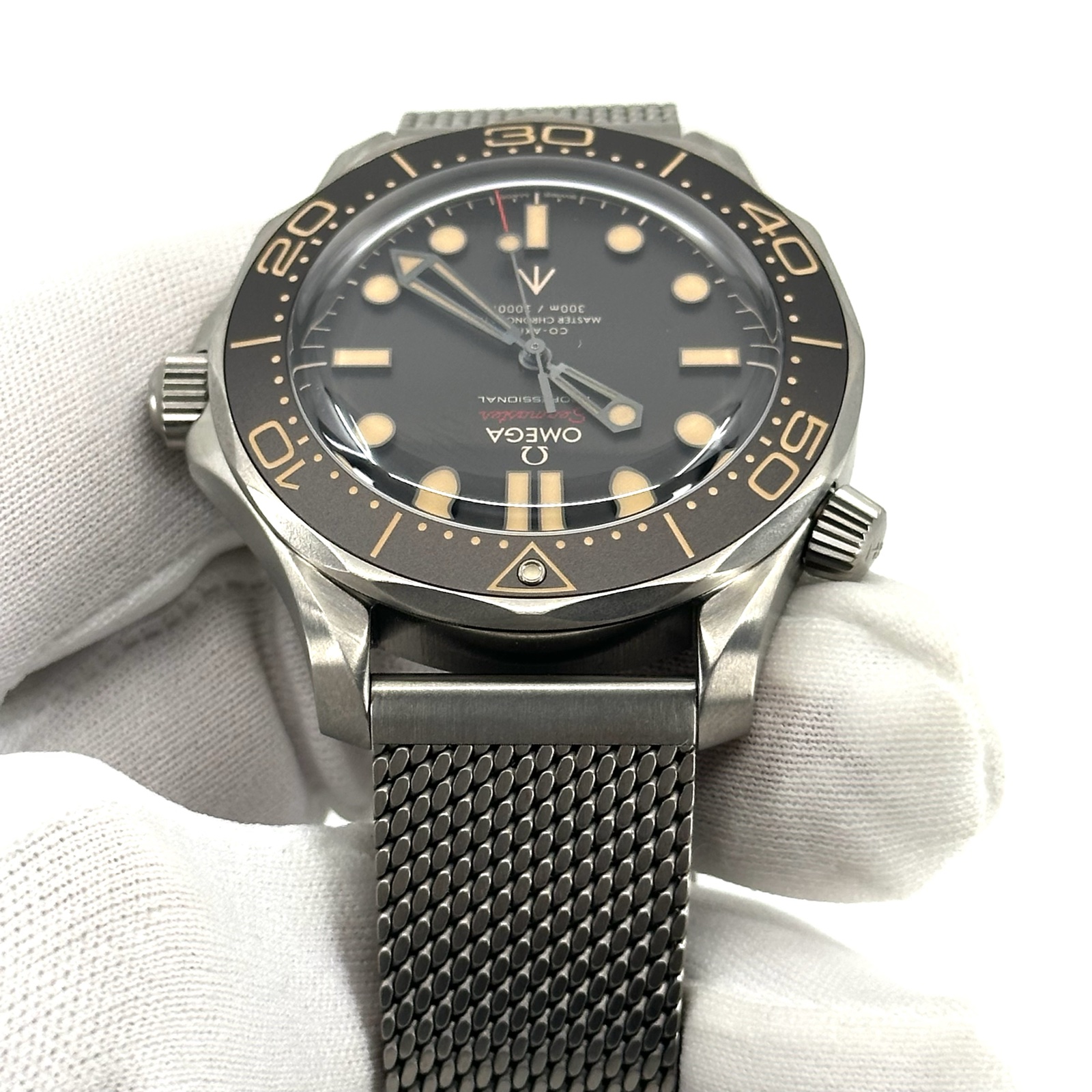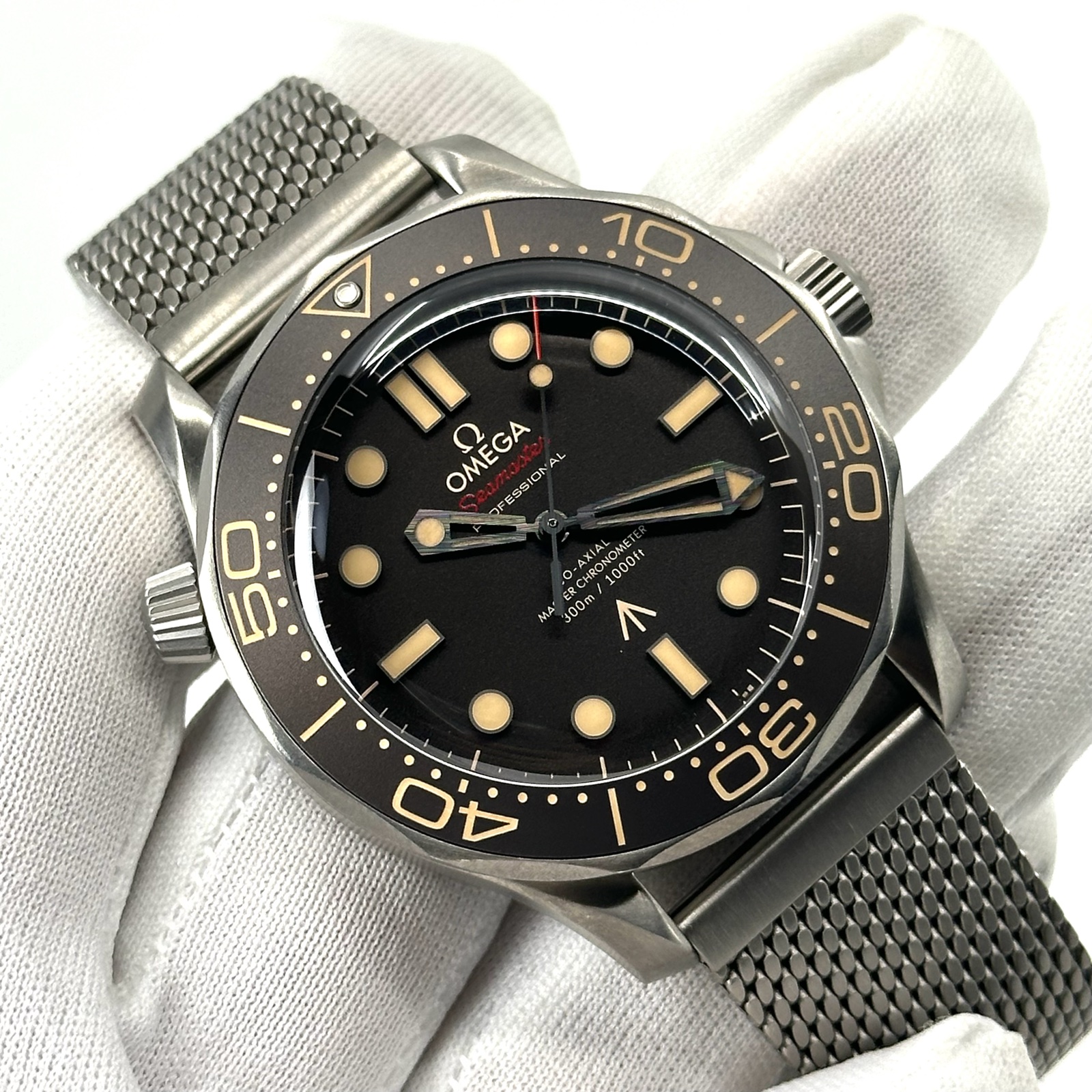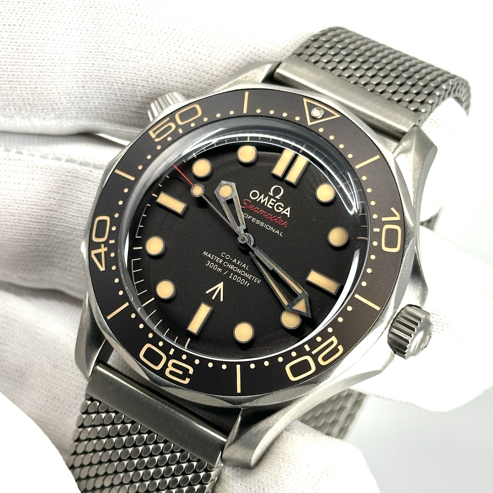 Daniel Craig reportedly wanted a titanium dive watch that looked like MOD-issued kit rather than a modern luxury sports watch, and Omega obliged — grade 2 titanium throughout, tropical-brown aluminum bezel and dial, cream-toned lume, and caseback engravings mimicking British military markings (0552 Royal Navy designator, 923/7697 for a 300m diver, A for screw-in crown, 007, and 62 for Dr. No's release year). The movement is Cal. 8806, the no-date variant of the 8800, engineered specifically so the dial could remain symmetrical without the date aperture at 6 o'clock that breaks up most 300Ms. Introduced in 2019 as a regular-production reference — not a numbered limited edition — it was the first Bond-branded Omega in a decade to earn full Master Chronometer certification. The titanium mesh bracelet with integrated adjustable buckle is the piece collectors reach for; the NATO is the lighter-wearing alternative.