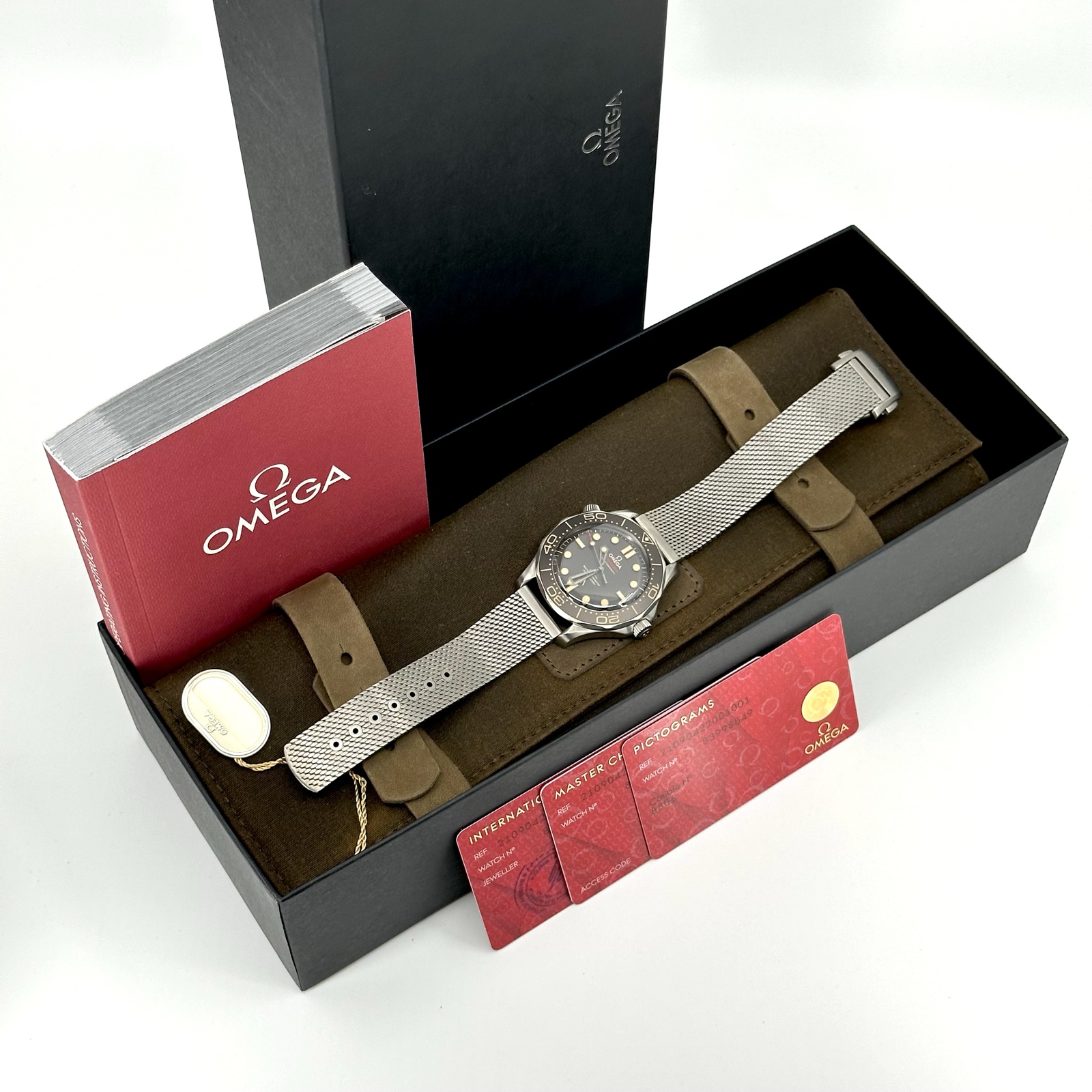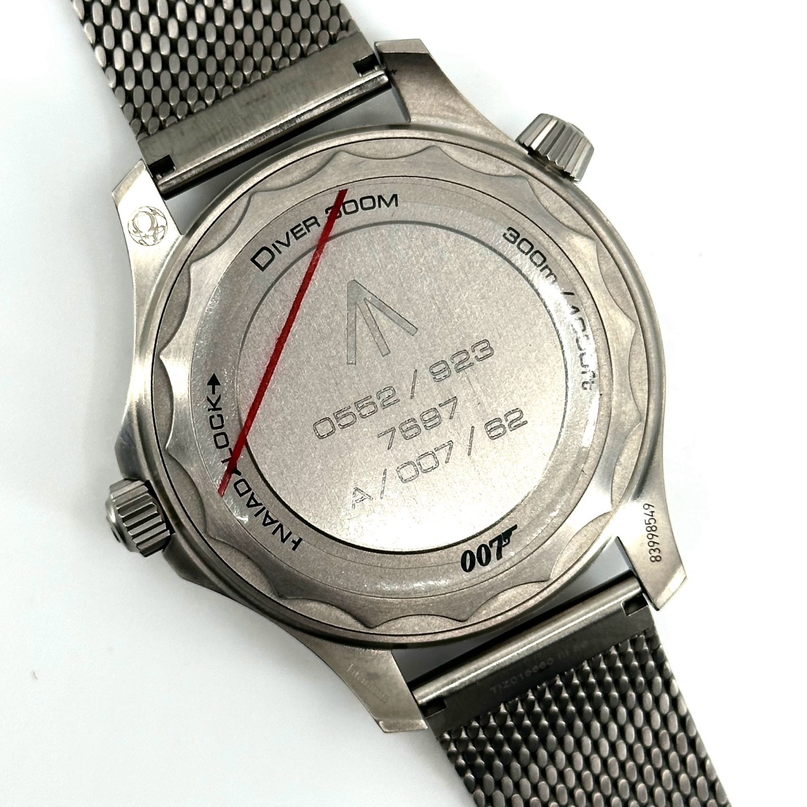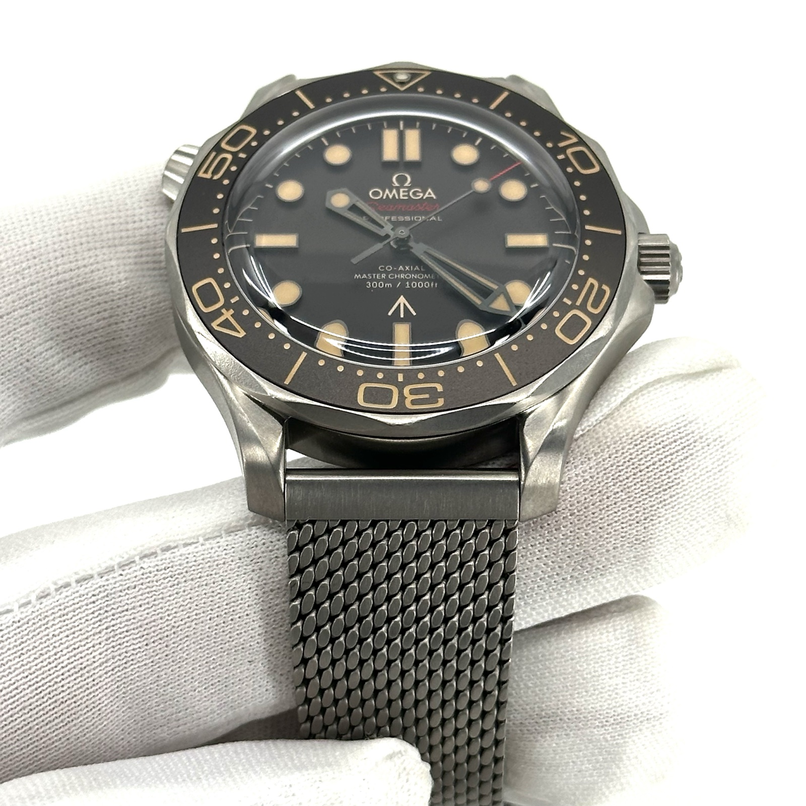 Daniel Craig reportedly wanted a titanium dive watch that looked like MOD-issued kit rather than a modern luxury sports watch, and Omega obliged — grade 2 titanium throughout, tropical-brown aluminum bezel and dial, cream-toned lume, and caseback engravings mimicking British military markings (0552 Royal Navy designator, 923/7697 for a 300m diver, A for screw-in crown, 007, and 62 for Dr. No's release year). The movement is Cal. 8806, the no-date variant of the 8800, engineered specifically so the dial could remain symmetrical without the date aperture at 6 o'clock that breaks up most 300Ms. Introduced in 2019 as a regular-production reference — not a numbered limited edition — it was the first Bond-branded Omega in a decade to earn full Master Chronometer certification. The titanium mesh bracelet with integrated adjustable buckle is the piece collectors reach for; the NATO is the lighter-wearing alternative.