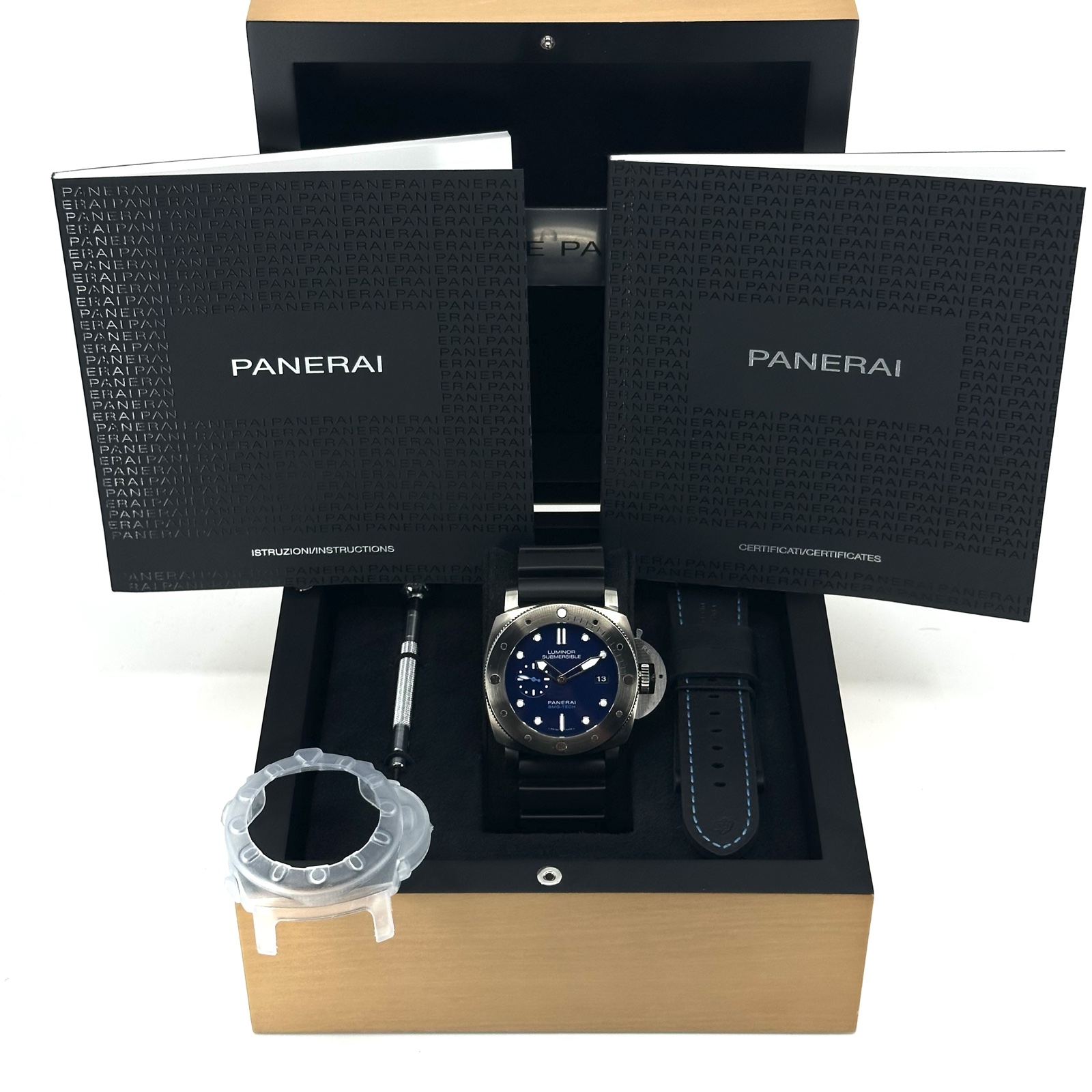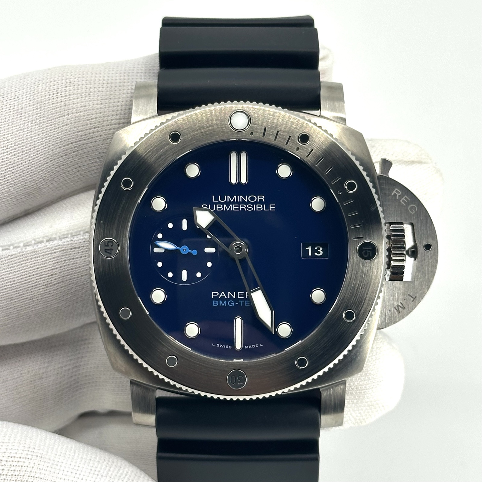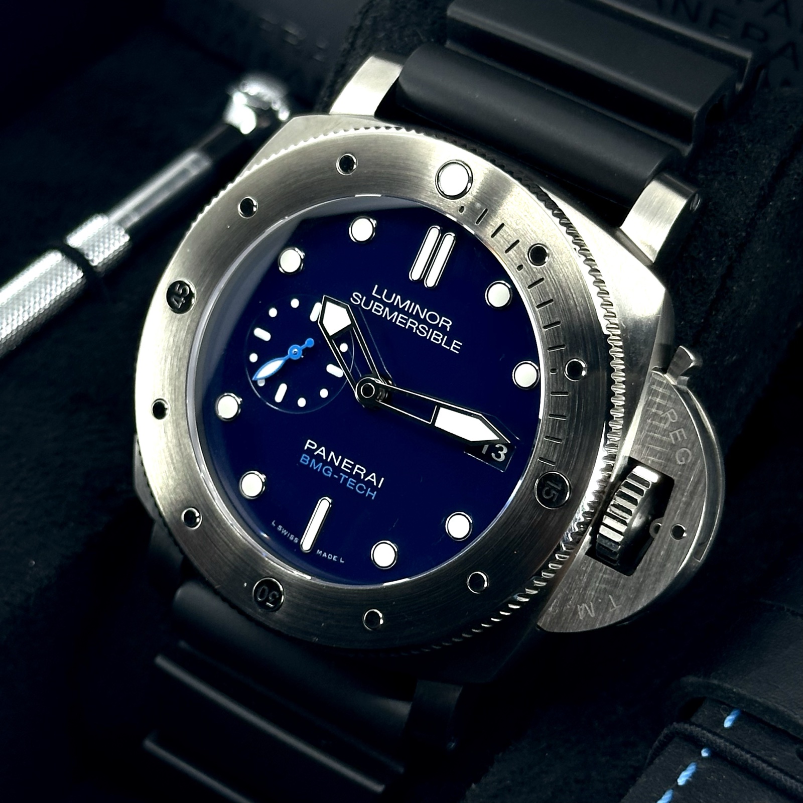 Launched in 2017 as a 1,000-piece limited edition, the PAM00692 exists expressly to showcase BMG-Tech, Panerai's proprietary bulk metallic glass alloy whose amorphous, non-crystalline atomic structure makes it lighter and harder than stainless steel while delivering superior corrosion resistance and anti-magnetic behavior. Within the 47mm Submersible lineup this reference is the material statement piece — a full-BMG case, bezel, crown, and crown-protection bridge construction, with only the caseback rendered in titanium to permit reliable threading and sealing for the in-house P.9010. The deep blue sun-brushed dial, skeletonized sword hands, and 300m rating keep the watch firmly in tool-watch territory, but the appeal here is metallurgical — a production application of a materials-science process that, until the 2010s, belonged to aerospace and sporting-goods research. For collectors, it is one of the more technically curious Submersibles Panerai has released and remains a reference that turns up less often than the steel or titanium siblings of the same generation.