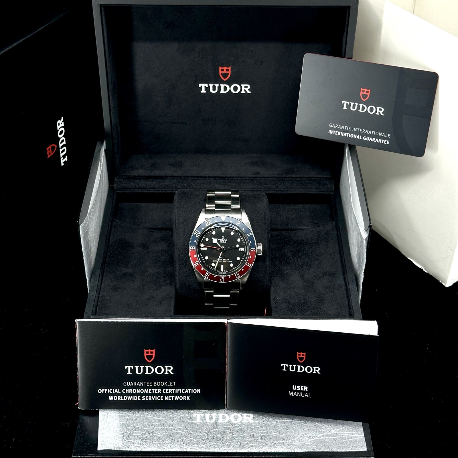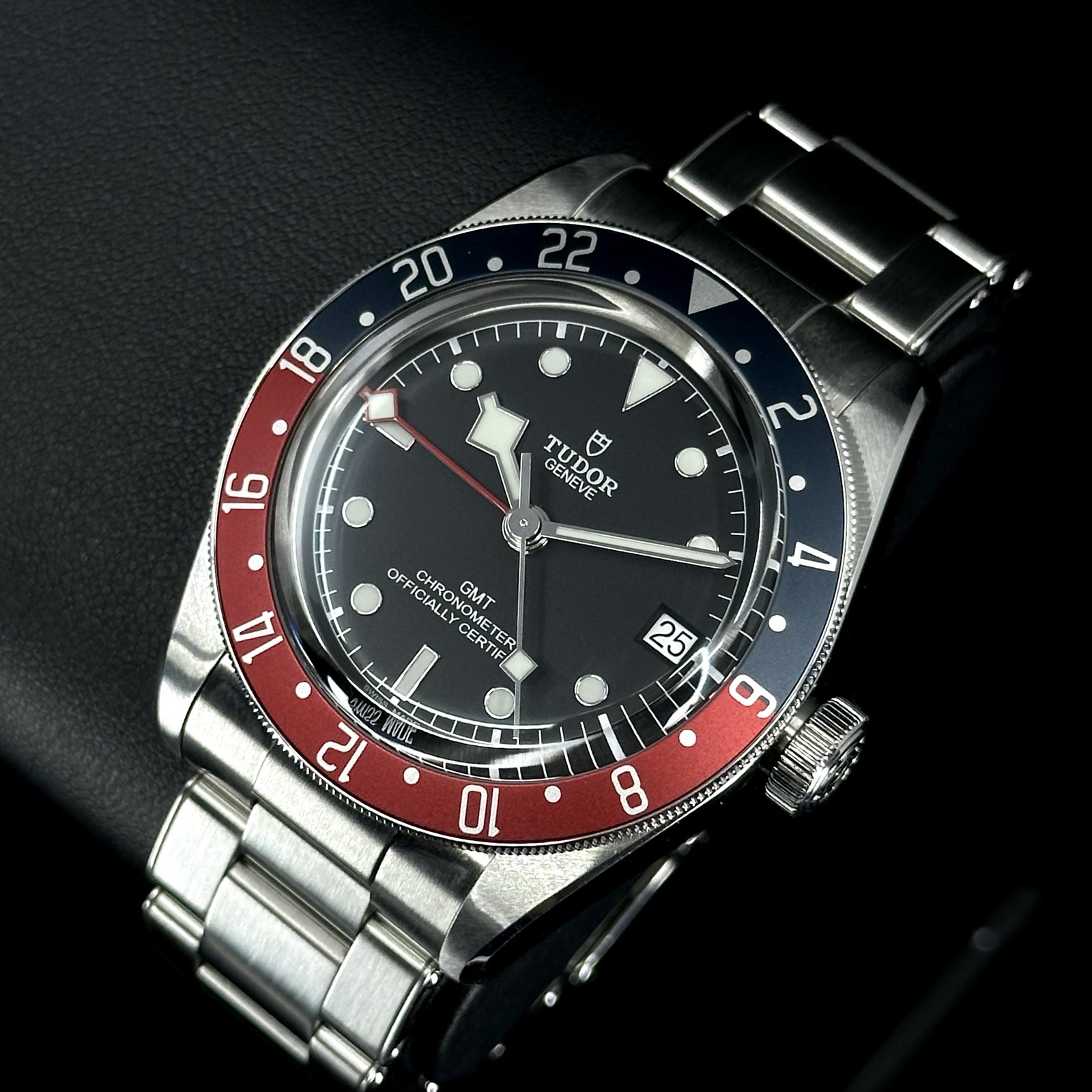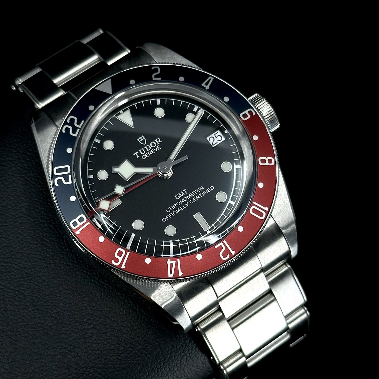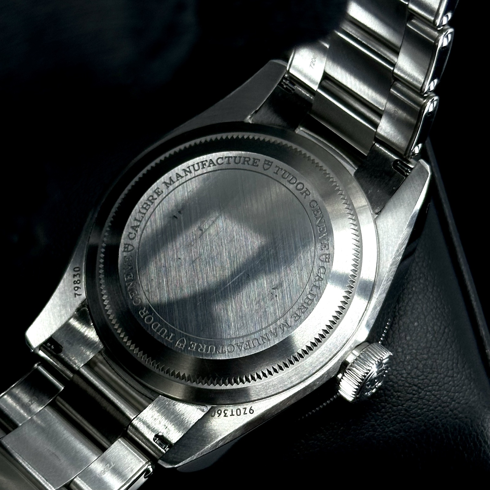 The M79830RB launched at Baselworld 2018 and was, at that moment, the most horologically serious Pepsi GMT on the market — it predates the steel Jubilee 126710BLRO by months and houses a manufacture caliber with a true traveler GMT complication (independent local hour jumping), a 70-hour power reserve, and silicon hairspring, at a price roughly a third of the Rolex equivalent. The matte burgundy-and-blue anodized aluminum bezel is deliberately vintage in tone where Rolex's Cerachrom is glossy and modern, and the Snowflake handset ties the piece back to Tudor's 1970s military dive-watch vocabulary. The -0001 suffix designates the steel-bracelet configuration on the riveted three-link. It is the GMT that reframed what "entry-level" Swiss tool-watch engineering could look like, and the reference that made the Black Bay line a serious catalog offering rather than a heritage sub-brand.